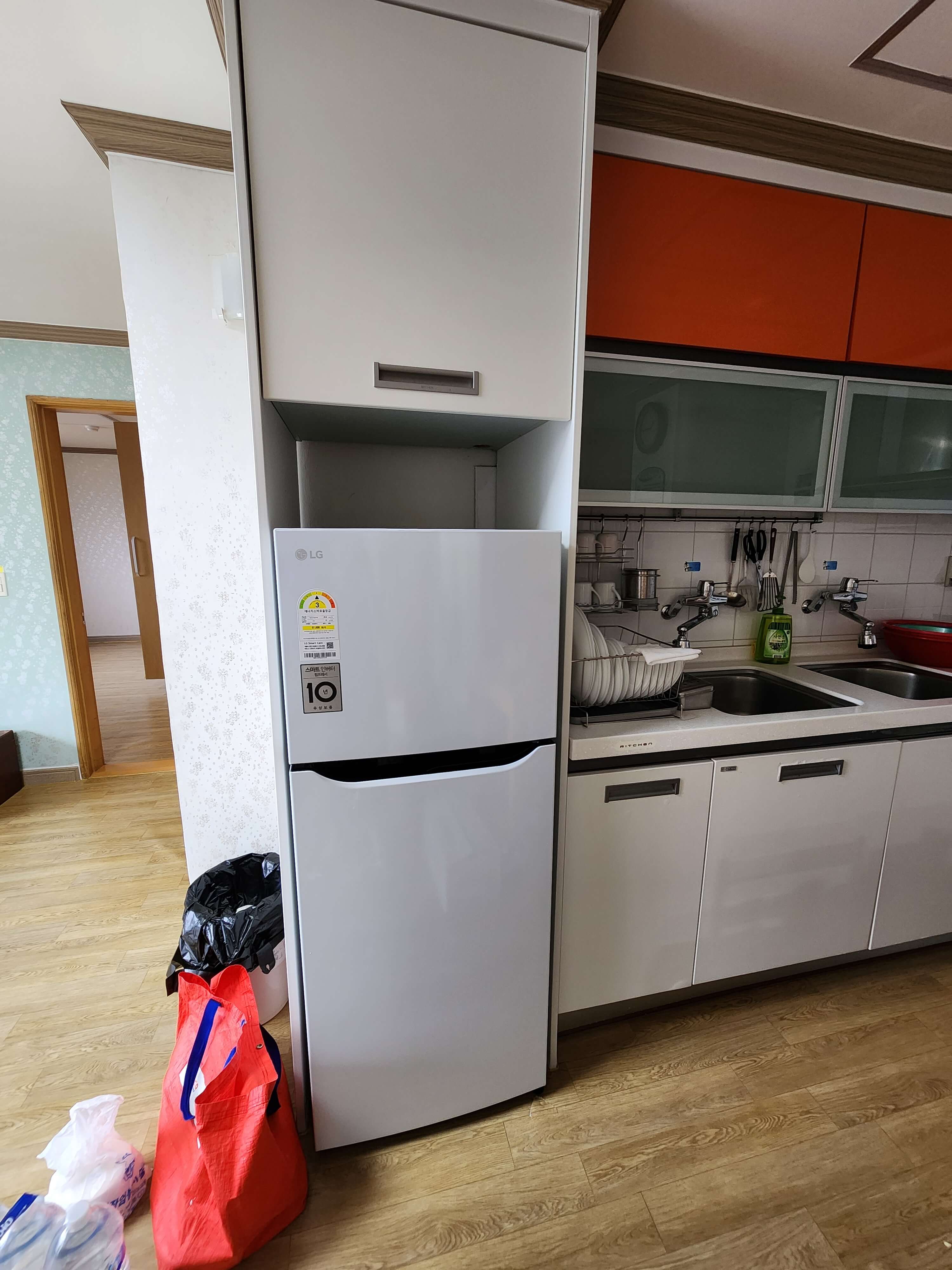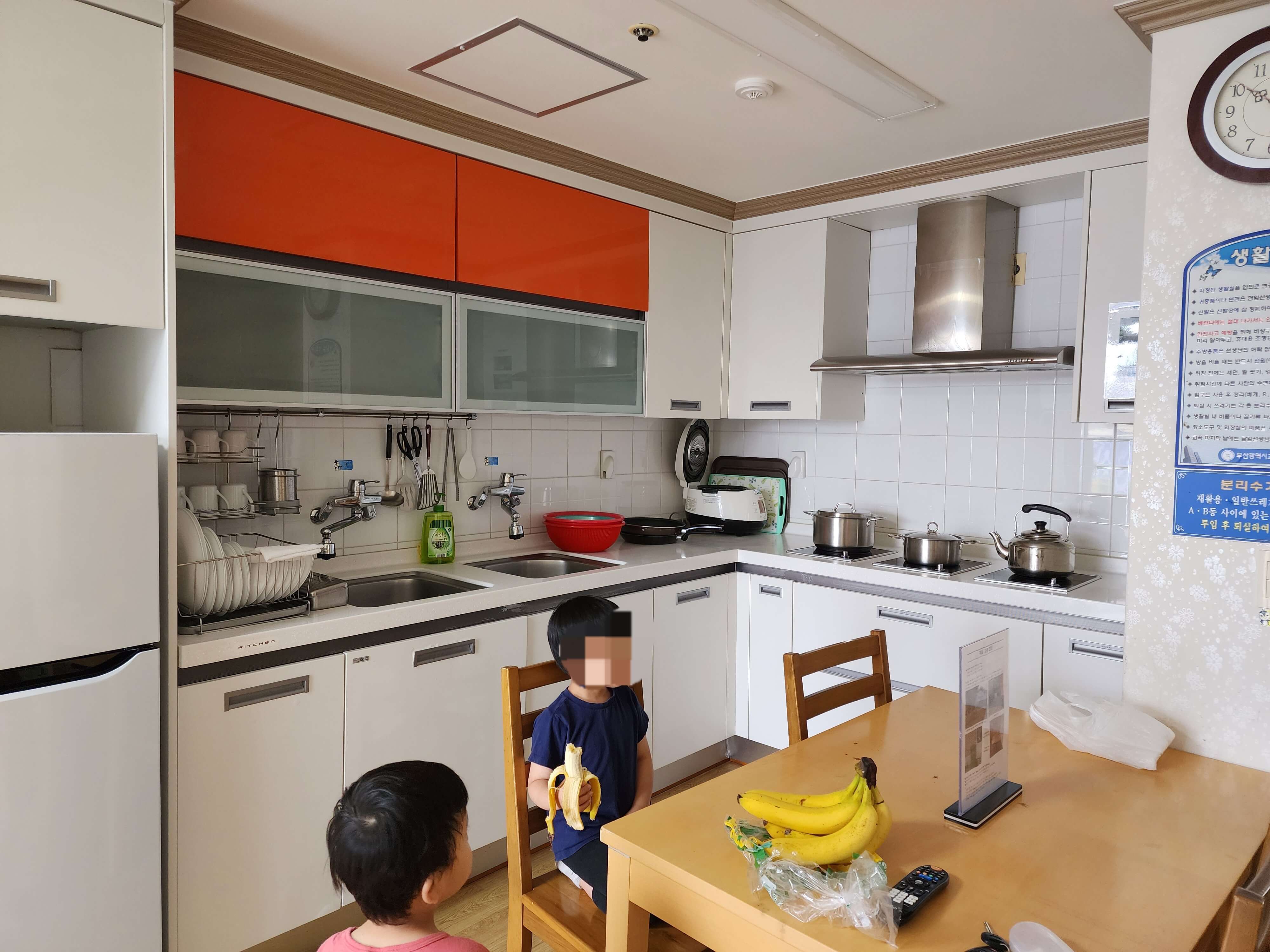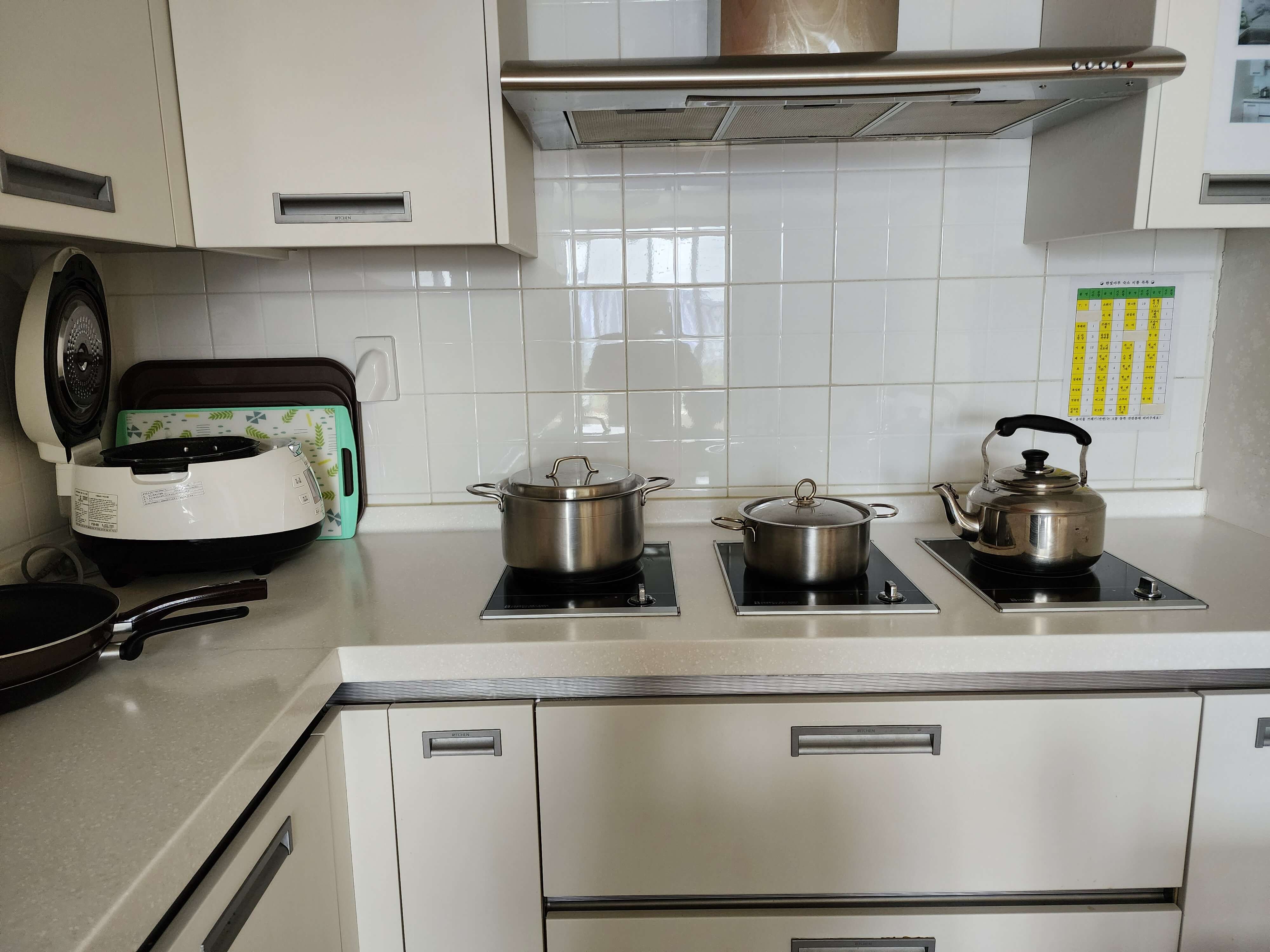 - 주방에는 냉장고, 밥솥이 있고 전기레인지가 3개 비치되어 있습니다.