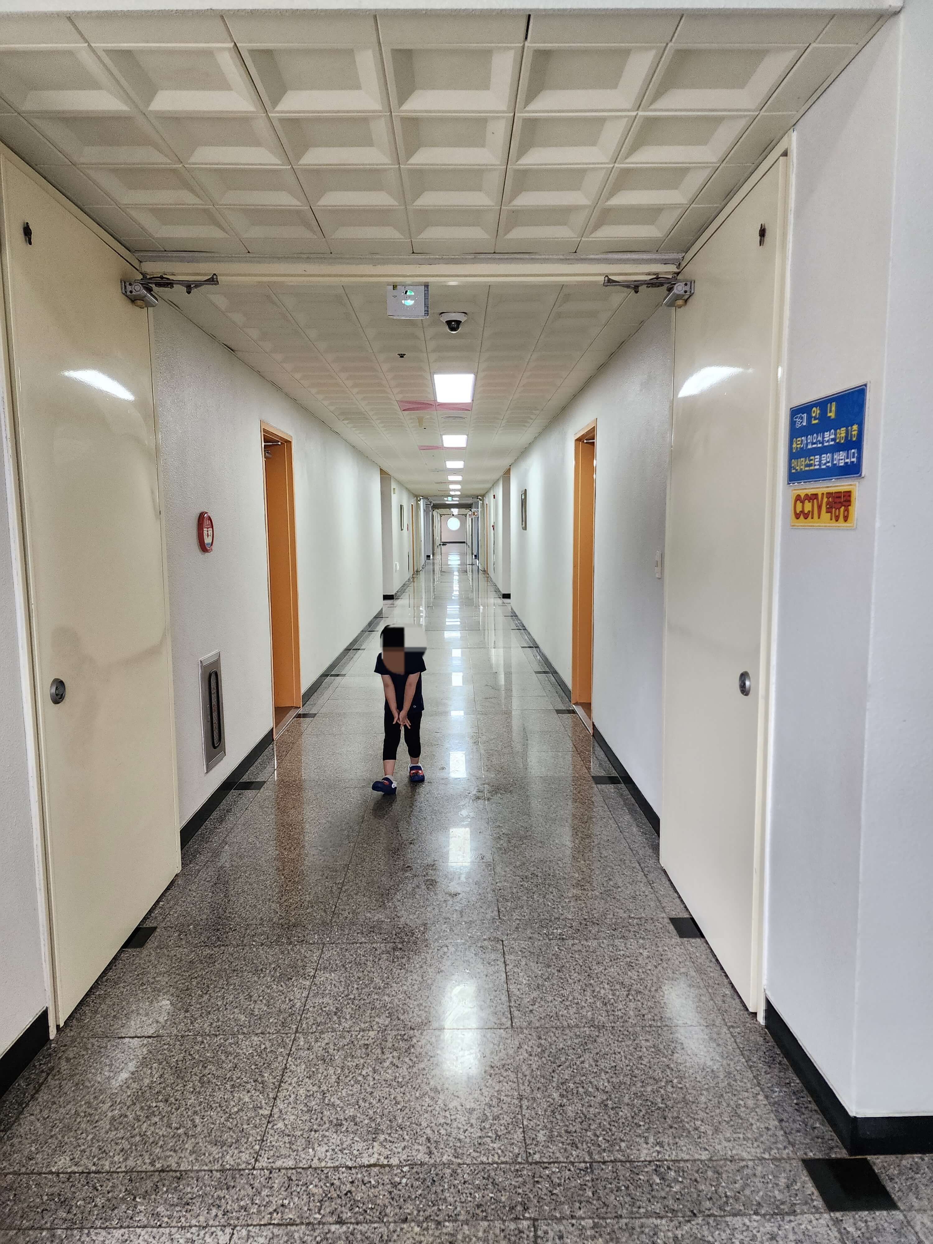 - 들어가면 길게 복도가 있습니다. 안내데스크를 기준으로 오른쪽에 방 4개, 왼쪽에 방 4개가 있습니다.