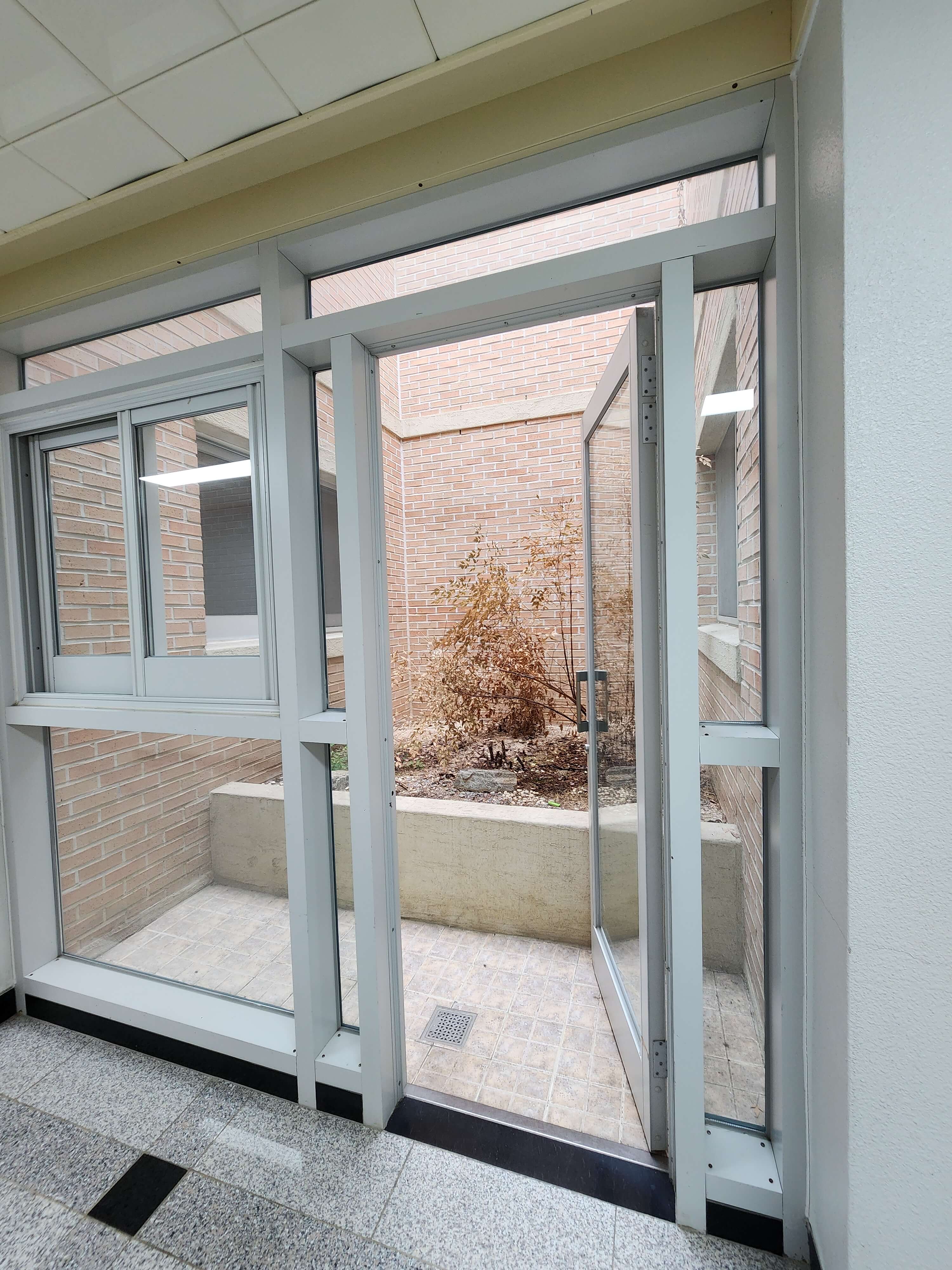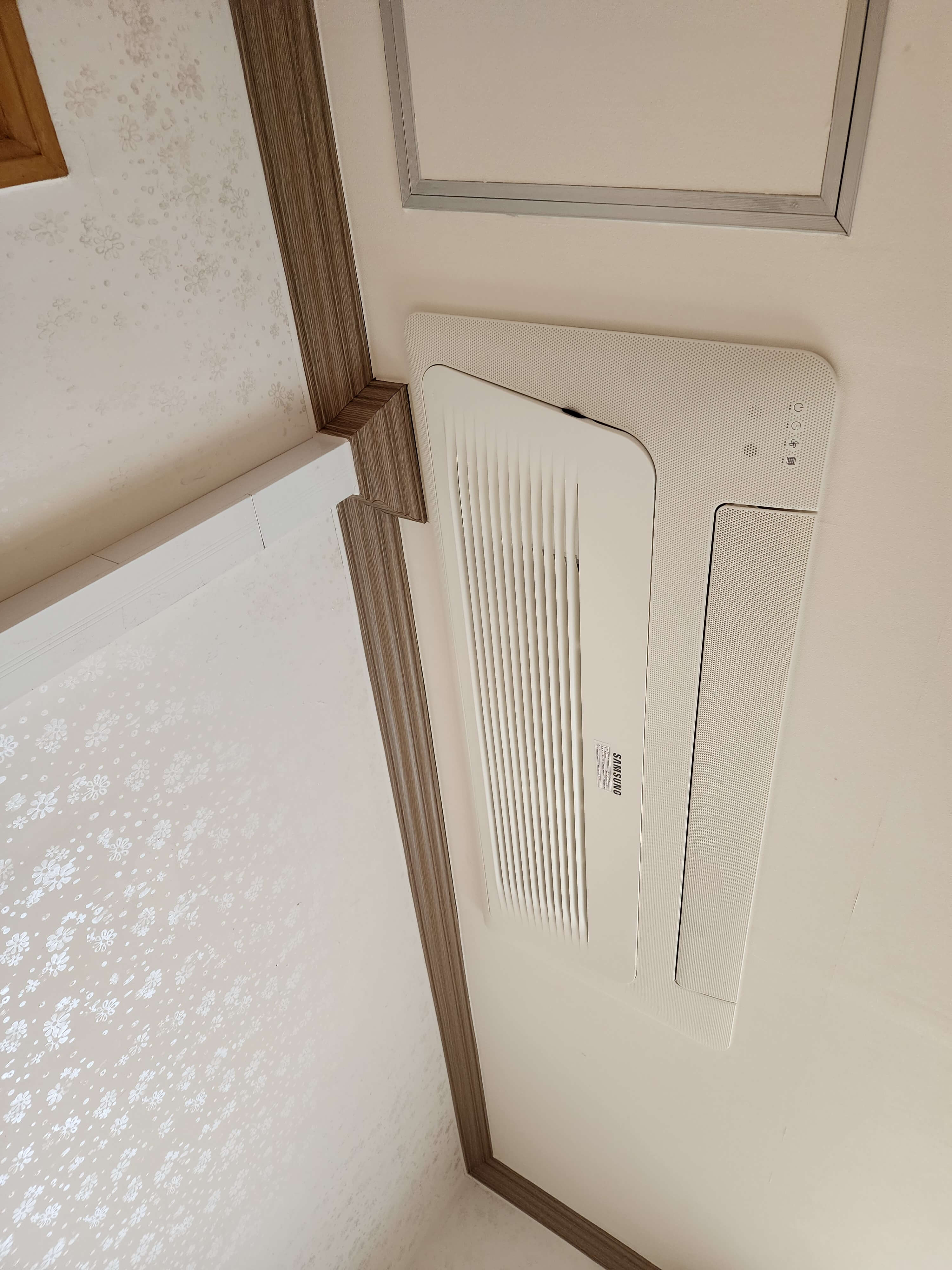 - 통창으로 되어 있고 TV가 있고 천장형 에어컨이 설치되어 있습니다.