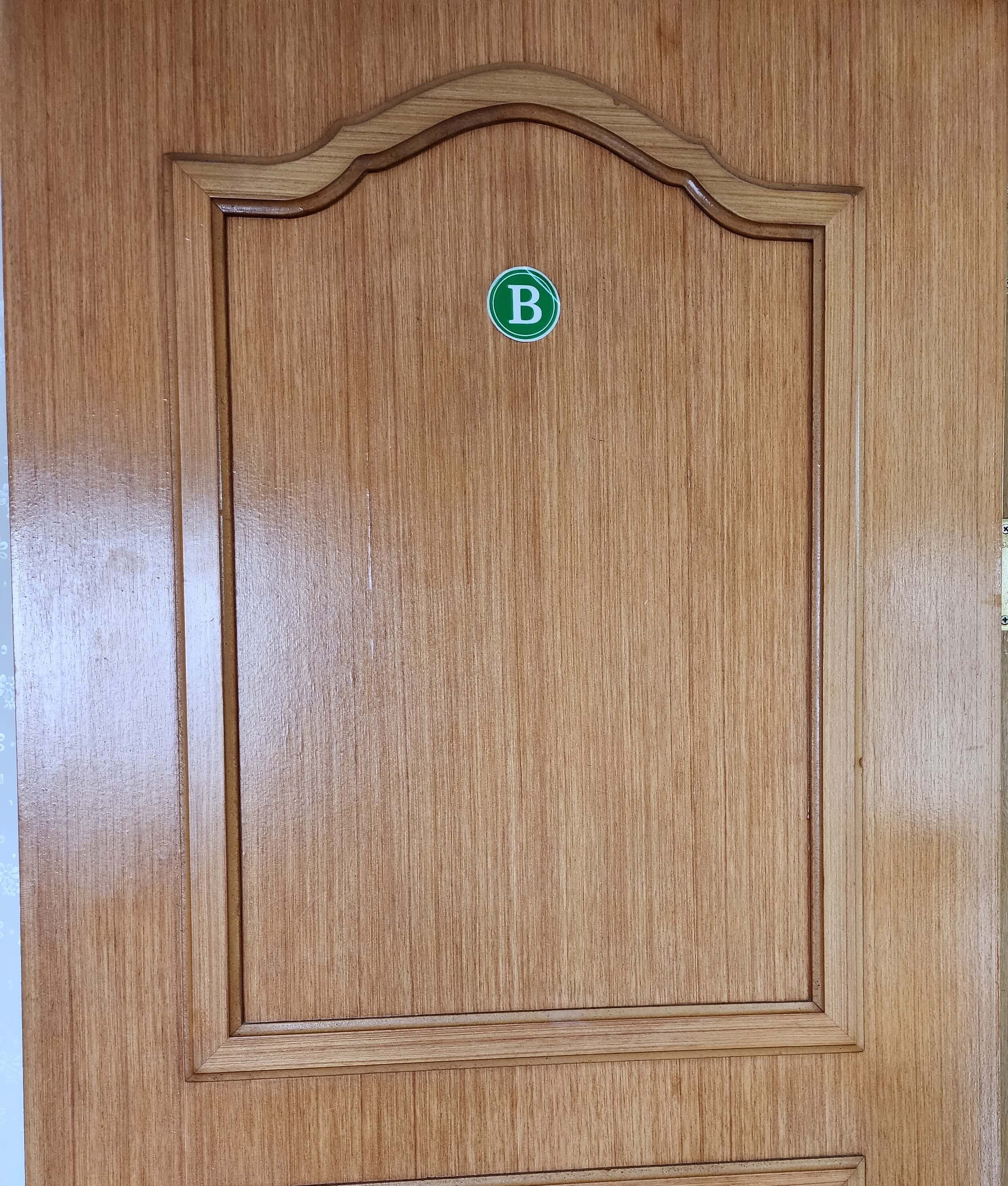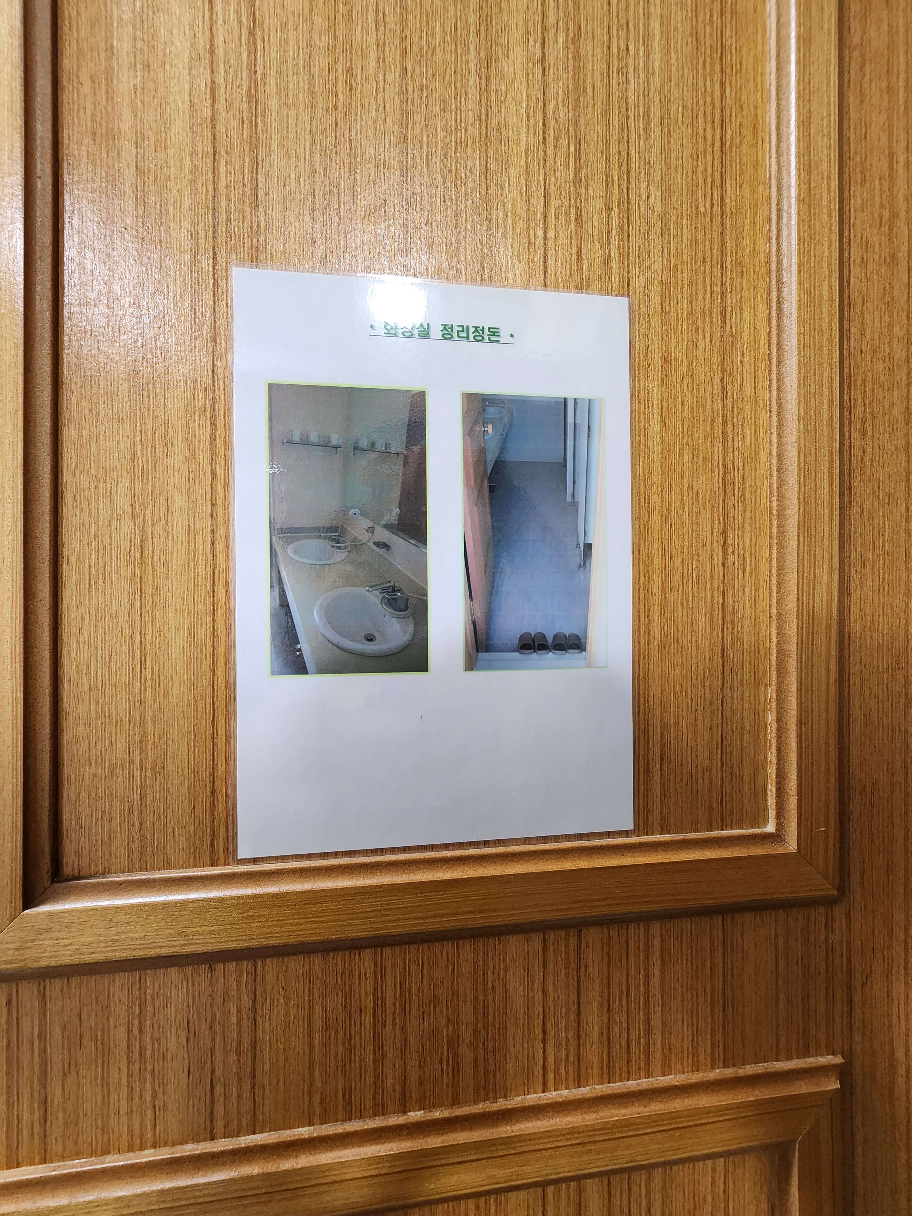 - 문에 화장실 정리정돈 예시가 붙어 있습니다.
